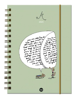 Agenda Tute 2025 con tapa dura con barniz brillante sectorizado, color verde. Medidas 15.5cm x 21.5cm. Contiene 160 páginas a 4 colores. Con banda para cerrar, stickers, wire-o, agenda telefónica, planificador de gastos y espacio para notas. Contiene viñetas del humorista gráfico argentino Tute.